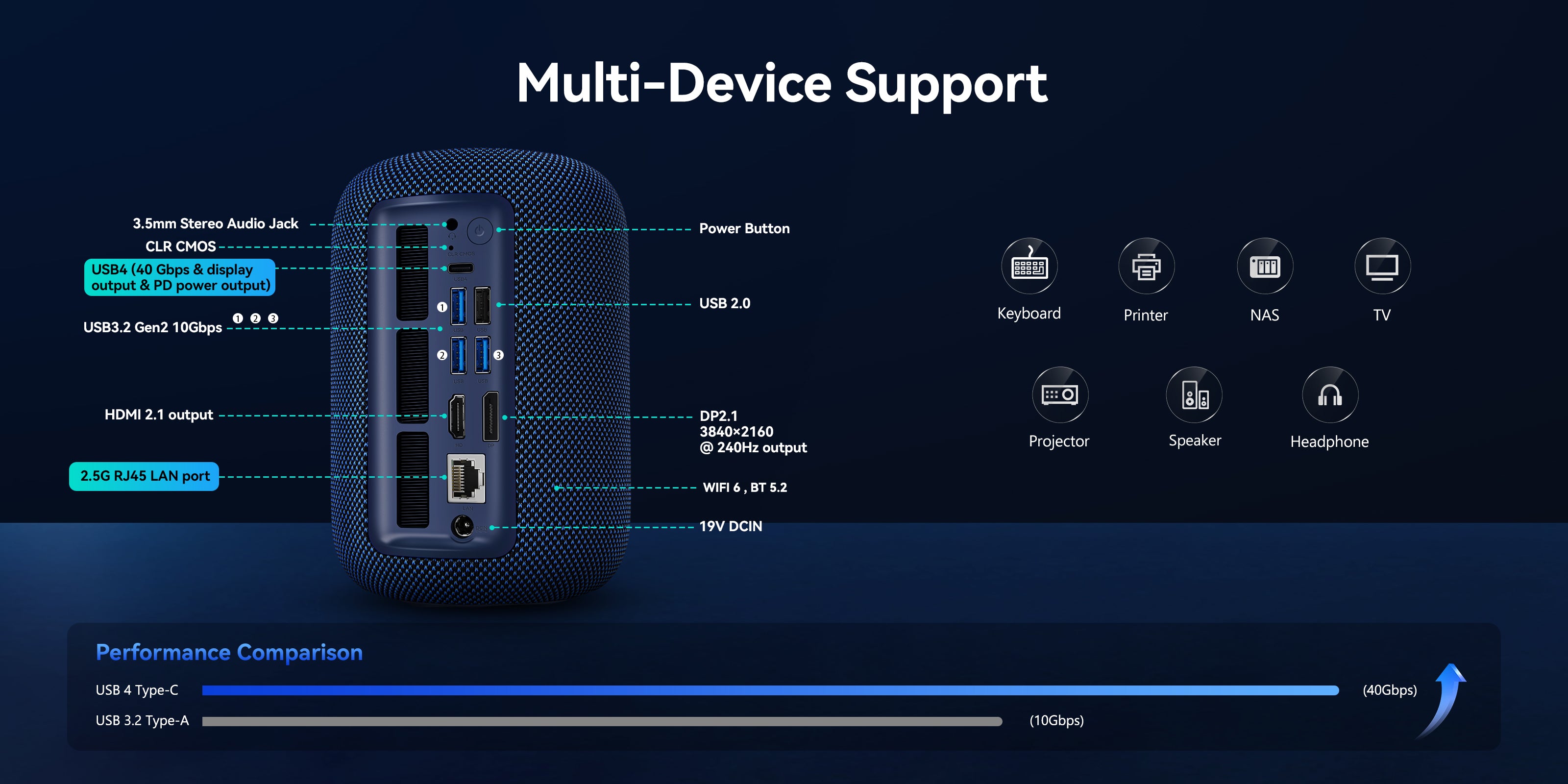 | Interfaces | 3*USB 3.2 Gen 2 (up to 10 Gbps transfer speeds), 1*USB 2.0, 1*Type C 10&40Gbps/Display(4K 60Hz), 1*DP 1.4, 1*HDMI 2.1, 1*Gigabit Ethernet, 1*audio jack, 1*DC jack |