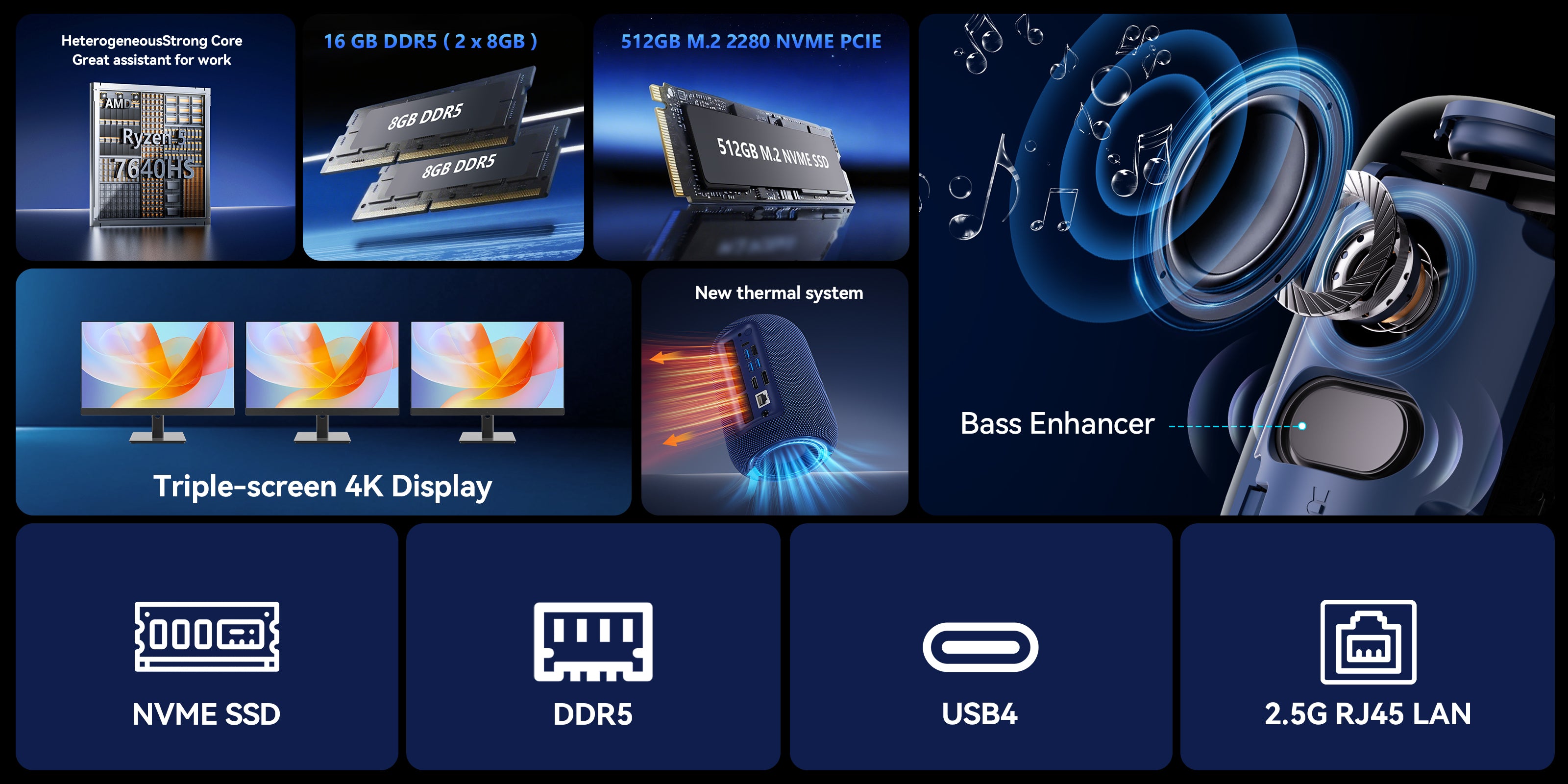 | CPU | AMD Ryzen™ 5 7640HS (up to 5GHz, 6 cores/12 threads, 16MB L3 cache, and 35-54W TDP) |